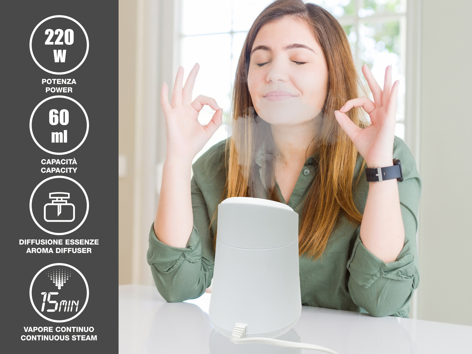• Dispune de rezervor de 60 ml si suport cu grilaj pentru esente parfumate, pentru o experienta de ingirjire completa